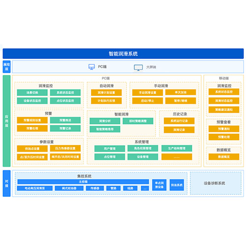 矿用机电设备自动润滑系统架构采用分层设计,包含展示层、应用层和集控系统。展示层通过PC端、大屏端提供直观的操作与监控界面,便于用户随时管理润滑任务。应用层作为核心,涵盖润滑监控、预警、参数设置、智能润滑、历史记录及系统管理六大模块,实现润滑过程的实时监控、异常预警、参数调整、策略优化及数据追溯。集控系统则由主控箱、电动高压润滑泵、阀式给油器、传感器等硬件组成,负责执行润滑计划,收集设备数据,并与应用层交互,根据智能策略动态调整润滑操作。三层之间通过数据流紧密连接,展示层与应用层通过PC和移动端实现双向通信,应用层则通过主控箱控制集控系统,形成闭环控制,确保润滑系统高效、智能运行。